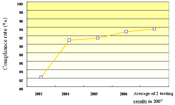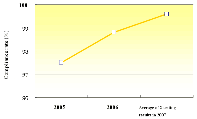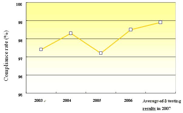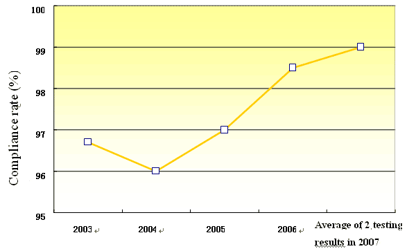 Figure 3 Compliance rate for sulfonamide residue limits in animal products based on inspections and tests, 2003-2007