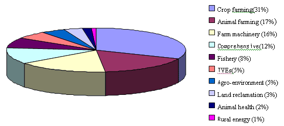 MOA is committed to the development and administration of agricultural quality control system. By the year 2006, there have been established 323 national (ministerial) quality control centers, and 1780 provincial, prefecture and county testing agencies. Figure 5 shows the distribution of the testing agencies by sub-sectors. A system, consisting of support and complementary centers at ministerial, provincial and country levels, for inspection and testing of agri-product quality and safety is gradually coming into being, which provides technical backup in strengthening supervision on agri-product quality and safety. By the year 2010, the government will have funded one ministerial-level research center on agri-product quality standards and testing techniques, 42 specialized quality control centers at ministerial level, 15 regional quality control centers for competitive agri-produce at ministerial level, 36 comprehensive quality control centers at provincial level and 1200 quality control stations at county level in order to improve institutional testing capacity and enable agencies at provincial level and above to have the same testing capability as their counterparts in developed countries.