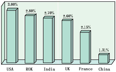 Overall, China's defense expenditure has remained at a fairly low level. In 1998 and 1999, the proportion of defense spending in the total state financial expenditure was 8.66% and 8.20%, respectively, and that in 2000 is 8.29%, all lower than those in 1997 or earlier (see Chart 1). In terms of US dollars, China's annual defense expenditure in 2000 is US$ 14.60 billion, which is only 5% of the USA's defense spending, 30% of Japan's, 40% of UK's, 48% of France's, and 64% of Germany's (see Chart 2). In addition, the percentage of China's defense spending in its gross domestic product (GDP) is also lower than those of the USA, the Republic of Korea (ROK), India, UK, France and some other countries (See Chart 3).