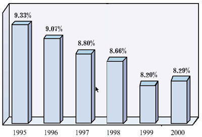 Chart 1 The Percentage of China's Defense Expenditure in the Total State Fi-nancial Expenditure 1995-2000