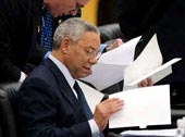 US Secretary of State Colin Powell looks over documents at Asian-Pacific Economic Cooperation Ministerial Meeting in Shanghai on October 18, 2001.