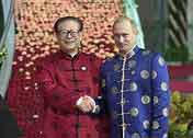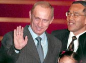 Chinese Prsident Jiang Zemin and the Russian President Vladimir Putin in Chinese-Style Costumes.(10/21/2001)