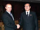Chinese President Jiang Zemin (R) meets with Russian President Vladimir Putin in Shanghai on Saturday, October 20, 2001. (10/20/2001)