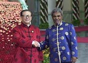 Chinese Prsident Jiang Zemin and Papua New Guinean Prime Minister Mekere Morauta in Chinese-Style Costumes.(10/21/2001)