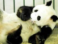 Giant panda "Qingqing" cuddles her tiny baby in Chengdu September 25, 2001. "Qingqing," a 17-year-old giant panda who has given birth to 8 litters, altogether 12 babies, is the giant panda with most babies in the world.