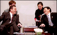 Chinese Premier Zhu Rongji met with German Chancellor Gerhard Schroeder in Seoul Thursday afternoon, and the two exchanged opinions over issues of common concern.
