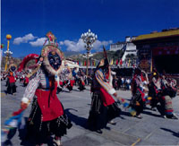 Dressed in brand-new Tibetan clothes and holding butter lamps, the worshipers moved in a long line slowly through each hall of the Johkang Temple, paying homage to the Buddha, and praying for blessings for their relatives, friends and themselves.