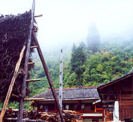 Within half an hour, Zhang announced that soup was on the table. We sat around a roughly made wooden table set by the cooking stove in the kitchen. We invited Zhang and his daughter to join us, but he declined, “You eat first, we’ll wait for her mother.” The mushrooms were so fresh and the preserved pork was so tasty that we all ate until we were stuffed. Zhang told us that the mushrooms were collected from the mountain standing behind his house. He climbed the mountain every three or five days to collect wild mushrooms and medicinal herbals. From the top of the mountain, he said, he could see the beautiful scenes of Huanglong.