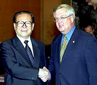 In a meeting with a group of members of the US House of Representatives led by Curt Weldon, Jiang urged the two sides to widen their common ground and treat their differences with mutual respect and moderation, and seek common views while putting aside differences for the sake of boosting ties.