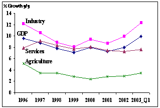 Value-added in industry recorded its highest increase since the Asian financial crisis, led by foreign-funded enterprises feeding the domestic boom in demand for industrial products as well as consolidating production in China for expanded sales in other markets. This strong performance has continued into 2003, with industrial growth during the first quarter of 17.2 percent (y-y). The problem with under-valuation of China's services sector output still exists. While the sector grew by 7.3 percent in 2002, compared to 7.4 percent the previous year, it is believed that some services growth is recorded in the manufacturing statistics, reflecting the high degree of vertical integration of economic activities that exists within Chinese firms, especially the state-owned enterprises (SOE).1
