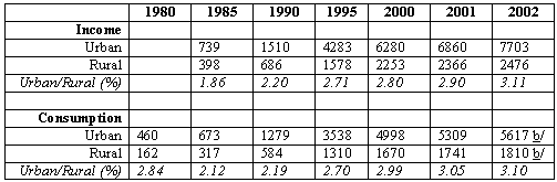 During 2002, on average real urban disposable incomes rose by 13.4 percent, and urban consumption rose by 4.8 percent. By contrast, real rural net incomes rose by 4.8 percent (up from 4.2 percent in 2001), while rural consumption rose by 4.4 percent (up from 3.5 percent the previous year). As shown in Table 2, the trend in urban-rural standards of living continues to be disturbing. Widening urban-rural inequality and its potential to undermine growth and social cohesion suggests that better targeting of government stimulus spending toward lower income groups will have a dual payoff-more powerful short term stimulus and long term growth.