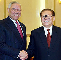 Powell conveyed President Bush's greetings to Jiang. He highly praised the current momentum in US-China relations. He said great changes had taken place in the international situation, and the two countries had jointly overcome the difficulties that once hampered bilateral relations, broadening the scope of US-China cooperation. He said the United States wished to further expand cooperative ties with China.