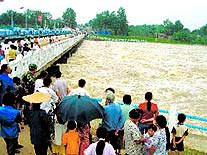 Though the opening of sluice gates at the Wangjiaba dam has eased water levels in the Huaihe River, they are still above the safety line because of continuous rainfall in the river's upper reaches.