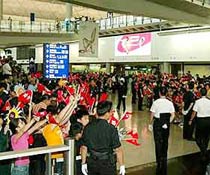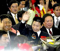 Hundreds of people waved national flags and regional flags of the Hong Kong Special Administrative Region (SAR) to welcome Yang Liwei and other guests at the airport.