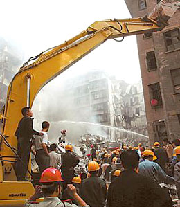 The burning building suddenly collapsed when a team of fire fighters was working inside.
