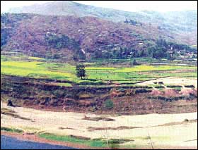 The Mingyueba market town ruins were situated about 78 km away from the new county proper of Yunyang. They were covered by wild reeds, shrubbery, Artemisia and creeping weeds. However, an archaeological team from the History Department of Sichuan University have dug out pits and ditches of different sizes, which look like trenches on a battlefield. Nearby, newly unearthed pieces of tiles, pottery and porcelain are laid out.