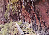 Others say the plank road was developed simply for people to pass. If this were true, one line of holes would be enough to hold wooden boards, but two lines of holes were found in many places. Why? If as someone supposed the upper row was used for a canopy, why was the space between the upper and lower holes not enough for a person to stand erect? What's even stranger is that some holes were dug under the cliff while there was enough space in a comparatively safe place. If people wanted to pass the road, they would need to crawl over. In some other places, a slope had been made ready, but why would people still dig out plank roads on the cliff?