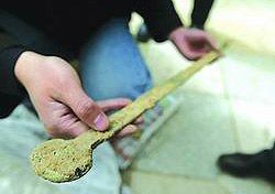 Of all the artifacts, the most attractive is the bronze sword. It is 69 cm long and 2-3 cm wide, with a handgrip extending to about 12 cm. Experts from the Beijing Cultural Relics Research Institute explained that the sword would likely have been worn at the waist on an every-day basis. This was no mere ornament but was clearly intended for use in hand-to-hand combat as can be seen today from its length and keen edge.