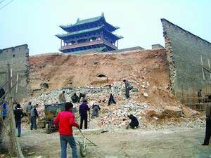 There is a rumor among local people that the county government decided to exploit tourism at the southern gate, since it's the nearest gate to the newly constructed Dayun highway (from Datong to Yuncheng). They approved a project without the permission of Jinzhong Cultural Relics Bureau that caused subsidence.