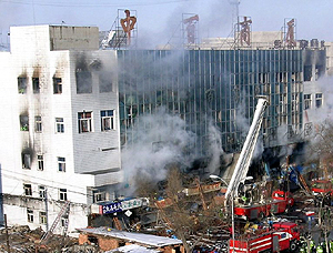 The blaze broke out around 11:30 am in a storeroom near the boiler room on the second floor of the four-story Zhongbai Commercial Plaza. The plaza has shops, a bathhouse, a poolroom and a dance hall, said Zhang Jianguo, senior official from the local information office.