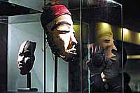 Two Chinese masks are maybe the highlight of this exhibition. Historical data shows that the Chinese landed in Africa in 1422. The Africans showed no aversion to Chinese appearance. On the contrary, they thought the countenance of the Chinese aided them to conquer difficulties and blessed them by arriving in Africa, peacefully. They engraved masks modeling Chinese appearance and painted them in beautiful colors. At prayer ceremonies, males would wear these kinds of masks to represent foreigners, while masks of Chinese women usually stood for motherly love, gentleness and kind-heartedness.