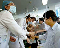 The hospital pulled more than 60 doctors from all its departments to deal with the flood of cases. Corridors and wards on the second, third and fourth floors were turned into emergency examination rooms.