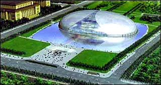 The largest cultural project during China’s Tenth Five-Year Plan (2001-05) period, the National Grand Theater is finally taking shape after nearly half a century of deliberations. Some 2.7 billion yuan (US$324 million) was allocated for construction of the massive 200,000-square-meter egg-shaped structure.