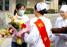 The patient, a medical postgraduate surnamed Song, shook hands with leaders of the Anhui University of Medical Science where she studies, and waved to the waiting crowd after walking out of the ward.