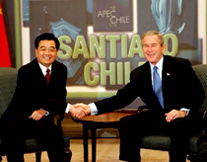 When talking with US President George W. Bush on the sidelines of the 12th APEC informal leadership meeting, Hu noted that bilateral high-level dialogue and contacts at various levels have increased, with new progress in cooperation in such fields as economy, trade, law enforcement and the fight against terror, and that exchanges between the two armies have basically resumed.