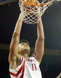 Playing at his hometown for the first time since joining the Houston Rockets during the 2002-2003 season, Yao seemed slightly nervous at first before the capacity crowd of more than 10,000. But the 2.26-meter center soon found his rhythm and scored his first basket four and a half minutes into the game, dunking on Tracy McGrady's assist.