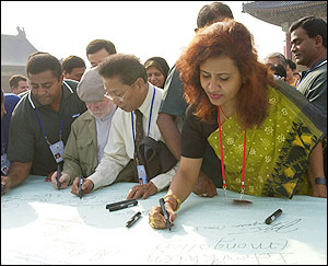 Before the final meeting, the delegates adjourned to the Altar of Prayer for Good Harvests at the Temple of Heaven Park, a UN World Heritage site. They were welcomed by hundreds of middle-school children waving flowers, accompanied by Chinese folk music. A huge length of green silk had been draped over a long ceremonial signing table in front of the altar.