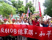 Despite rains, the protesters chanted "No to weapons purchases, Save Taiwan."