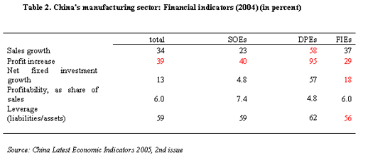 China's manufacturing sector saw rapid expansion in 2004, without, on the whole, a weakening of financial indicators (Table 2). Sales growth was particularly high in coal, ferrous mining, furniture, and smelting, and profit growth in coal, oil and gas, mining, food processing, petroleum refining, smelting, metal products, and machinery. With net fixed assets growing somewhat less than sales, there were no obvious signs of over-investment. And, with liabilities only just outpacing overall net fixed assets growth, the overall liabilities/asset ratio increased only slightly, to 0.59, indicating leverage (liabilities/equity ratio) of 145 percent -- far below averages for companies in South Korea, Thailand, and Indonesia prior to the 1997 financial crisis.