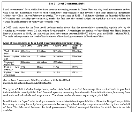 The government's "3 rewards and 1 subsidy" initiative recognizes the significant fiscal problems of counties and townships, it tries to structure a set of incentives and sanctions to improve local fiscal performance, and recognizes that local spending is often inefficient and that counties and townships may be overstaffed. RMB 15 billion (0.1 percent of GDP) is allocated for central government transfers to county-level government, based on performance judged using criteria including streamlining of the local government. Nevertheless, expectations on its impact should be modest, given that the size of the transfers involved is limited and there is little international evidence that transfers have been used effectively as an incentive to increase local revenue mobilization. The initiative does also not address the deficiencies in the intergovernmental fiscal system. Further reforms aimed at increasing local revenues could usefully consider giving local governments more local autonomy in taxation, reducing the overall level of transfers in the system and targeting them better to the poorest areas, and linking tax payments to services delivered.