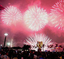 While the explosively multi-colored sparkles fell and faded in the dark sky, laughter and happiness carried on among the crowd forming a harmonious ambiance in the city.