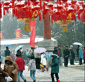 Heavy snow that began falling Tuesday morning throughout eastern and central China posed a challenge but did little to shrink the crowds of holiday travelers returning to the cities on the last day of the week-long Spring Festival holiday.