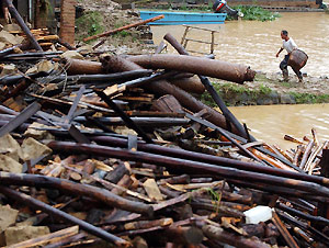 Yang Zhiai, director of the Rescue Department of the Hunan Provincial Red Cross, yesterday visited Xiao Yang's village, Taizhimiao, where the 400 residents have seen many of their homes destroyed.