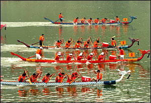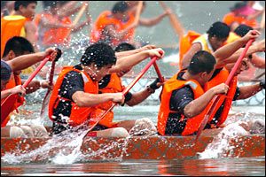 On duanwujie, glutinous rice dumplings wrapped in bamboo leaves, or zongzi, are thrown into the river. Legend has it that it was to prevent the fish in the river from eating Qu Yuan. Dragon boat contests are also a main feature of duanwujie celebrations.