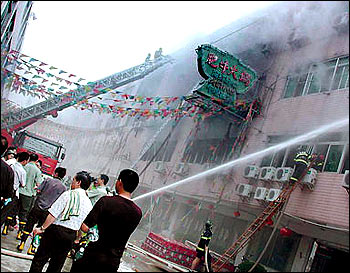 The fire broke out around 12:20 at Friday noon and engulfed the top three floors of the four-story Huanan Hotel, which is located in a downtown district of Shantou City, local police said earlier.
