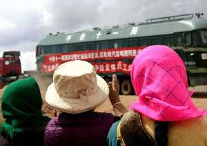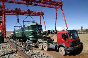 A diesel locomotive, the last of 30 needed in the Qinghai-Tibet Railway Project arrived at the Amdo track-laying base in Tibet on June 14, all 138 tons of it. The locomotive was dismantled into three parts and was carried in three trucks from the Xiushui River base to Amdo, a distance of some 400 kilometers.