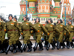 A salute was fired and the Russian national anthem played before the parade began. Soldiers in modern and WWII-era uniforms and with WWII-era weapons marched in tight formation, the slap of their boots echoing across the square's cobblestones.