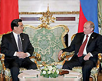 In their talks in the Kremlin, Putin thanked Hu for coming to take part in the celebration of the 60th anniversary of the end of World War II in Europe, saying that his government and people always remember that China and the Soviet Union made a great contribution to victory over fascism.