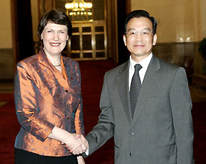 Wen told Clark that China will enhance political trust and positively and prudently push forward the FTA talks along with New Zealand in line with mutual respect, equality and mutual benefit.