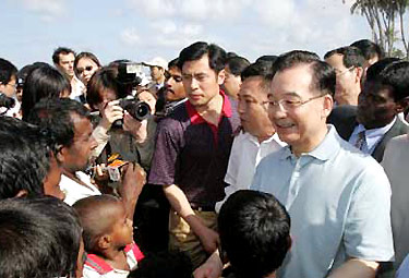 Premier Wen Jiabao visits Panadura, a tsunami-hit fishing harbor 27 kilometers south of Colombo on April 9, 2005, and chats with local fishermen.