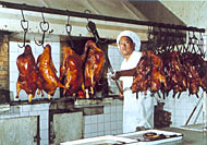 The slicing of the meat from the carcass of the duck is an art in itself. A skilled chef is able to cut between 100 and 120 slices in four or five minutes, each slice with an equal portion of both skin and meat. Inventiveness is another quality cultivated at Quanjude. One seasoned chef has mastered more than 80 dishes made from the duck?s innards, head, wings and webs. A selection of these dishes, whether hot, cold, boiled, fried, stewed or pickled, will be the makings of an all-duck banquet.