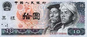 The left-hand image on ten yuan note is from the Mongolian ethnic minority in Inner Mongolia and Xinjiang Uyguar autonomous regions as well as Jilin, Heilongjiang and Qinghai provinces with a total population of 4,802,400. The right-hand image represents the Han nationality.