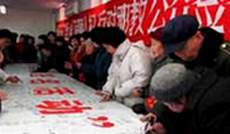 Citizens sign on a scroll in a campaign against the Falun Gong Cult and advocating the human rights in Beijing Wednesday Jan.31, 2001. This public campaign was staged in the wake of disclosure of suicidal attempts of 7 Falun Gong practitioners by burning themselves at Tiananmen Square on Jan.23.