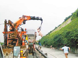 A 15-ton crane was sent to hoist the sows back to the truck one by one with two 5-meter-long ropes.