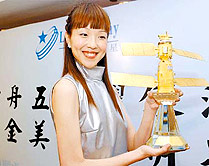 A Hong Kong model Thursday shows off a HK$500,000 (US$64,350) gift modeled on the Shenzhou V spacecraft, which will be given to taikonaut Yang Liwei in recognition of his historic space flight. The gift is made of 550 grams of gold and a cluster of diamonds.