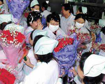 They emerged smiling and flanked by flowers after two weeks in the strict quarantine sections of the hospitals.